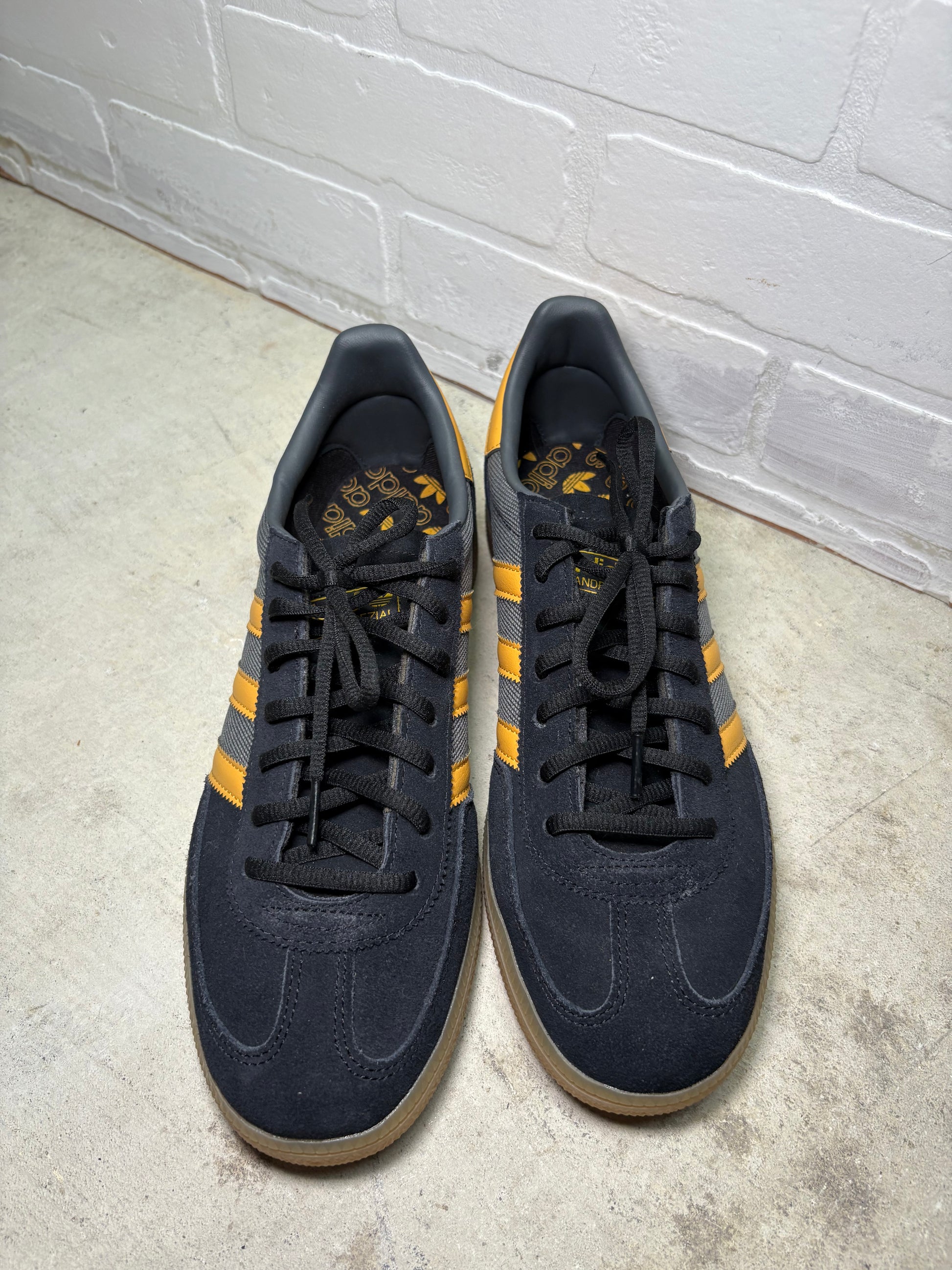 Iconic Adidas Samba sneakers featuring black suede upper, gold stripes, and gum sole. A classic indoor soccer and streetwear shoe with timeless style. Light wear only, plenty of life left.