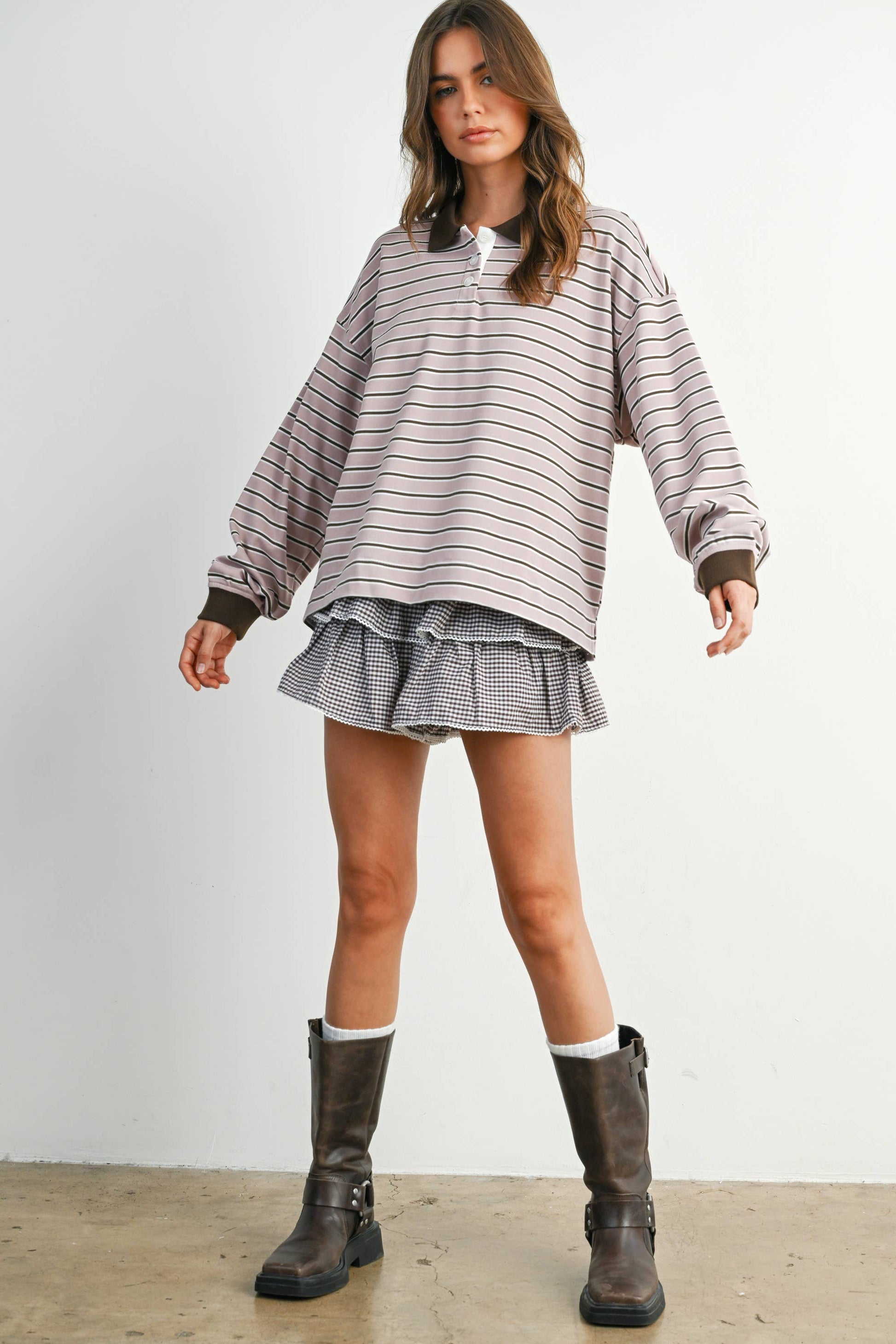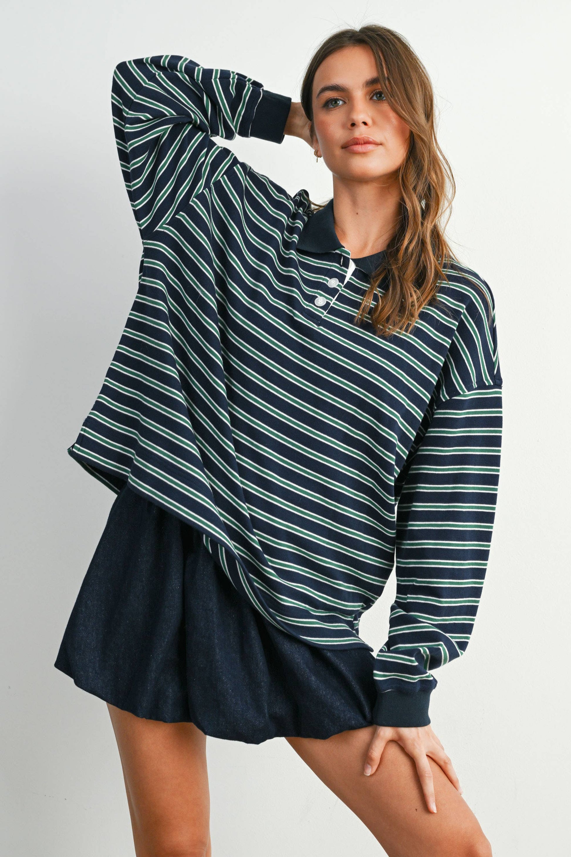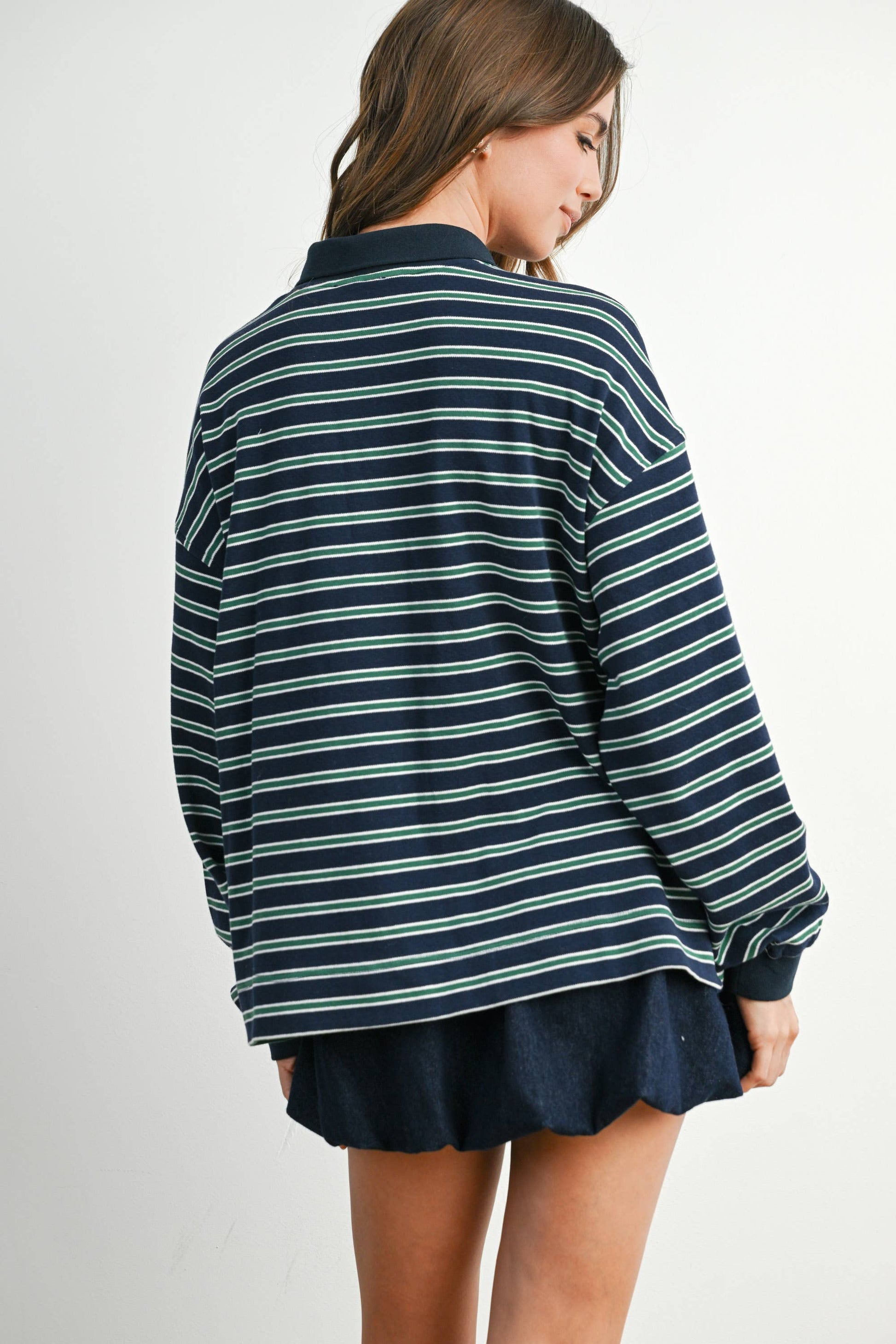 Classic and comfortable, this quarter-button striped collared long sleeve top brings timeless style to your everyday wardrobe. Featuring a smart collar, partial button-front detail, and a relaxed striped pattern, it's perfect for casual days or laid-back outings. Pair it with jeans or trousers for an effortlessly polished look.