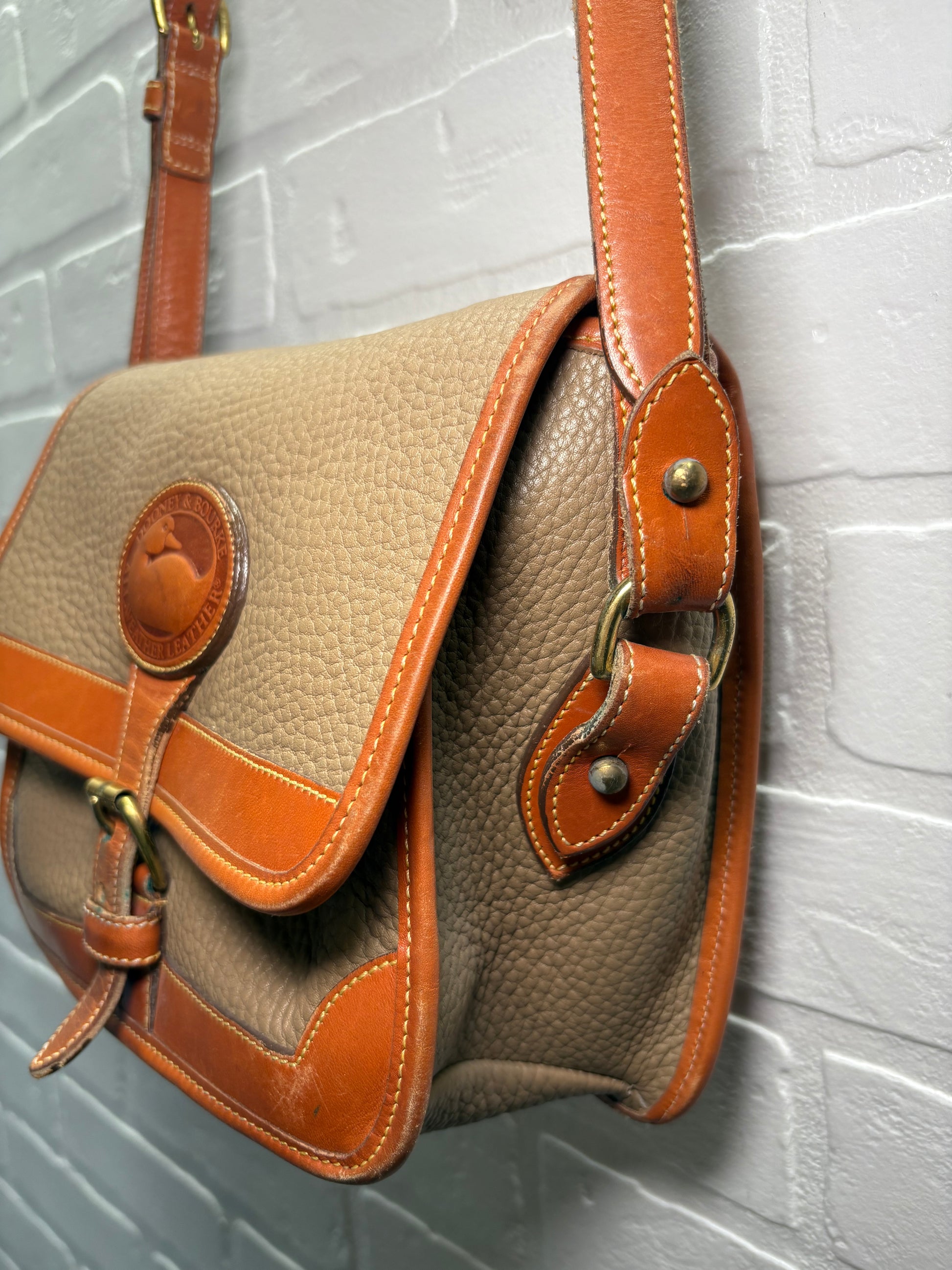 Authentic Dooney & Bourke crossbody purse crafted from durable all-weather pebbled leather. Features a neutral gray body with classic tan trim, front flap closure, adjustable shoulder strap, and signature duck logo medallion. Compact yet functional — perfect for everyday wear.