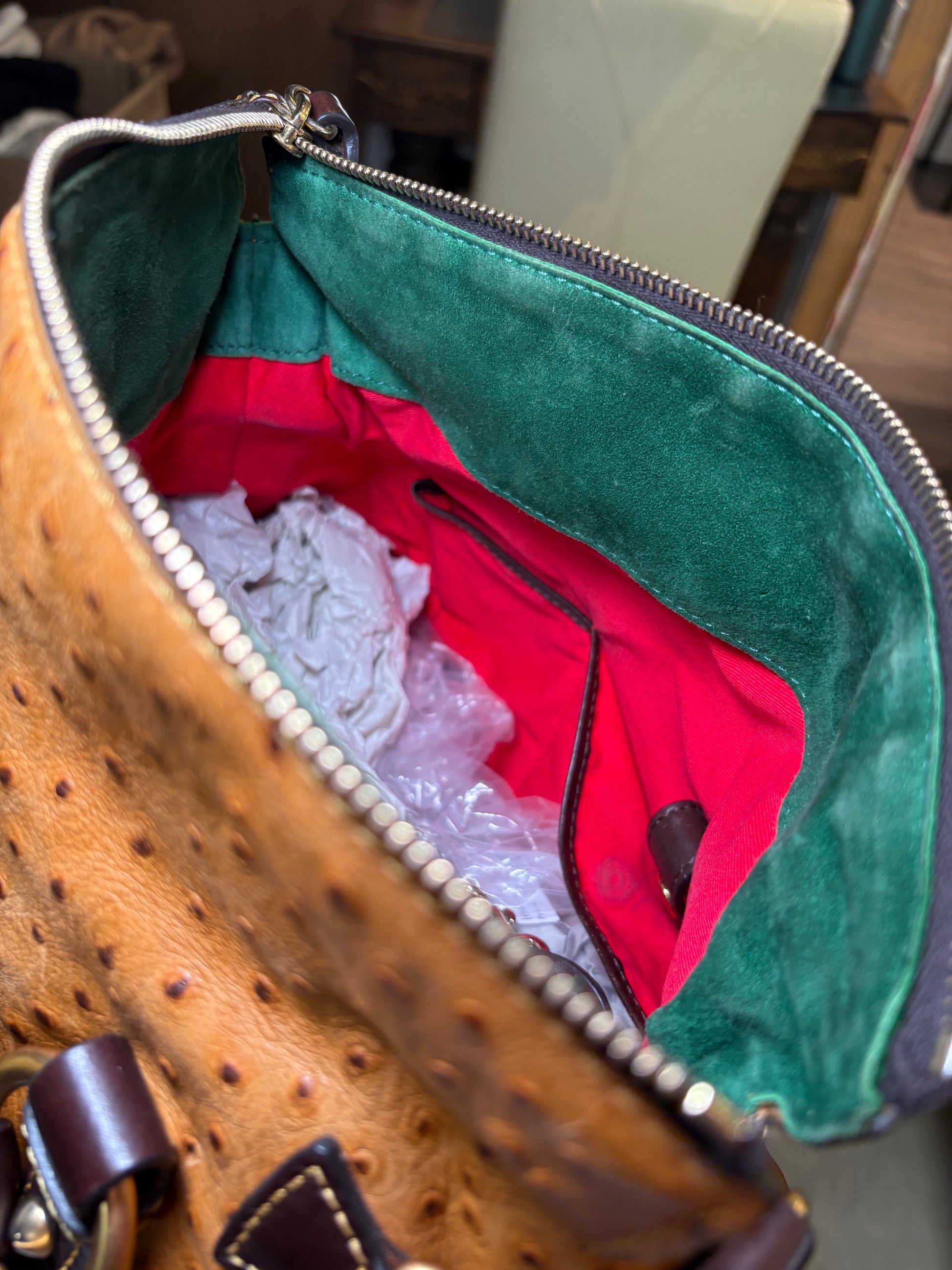 Timeless and effortlessly chic, this Dooney & Bourke satchel is crafted in rich cognac ostrich-embossed leather with deep brown trim and warm gold-tone hardware. The structured silhouette offers everyday functionality while maintaining a refined, elevated look.