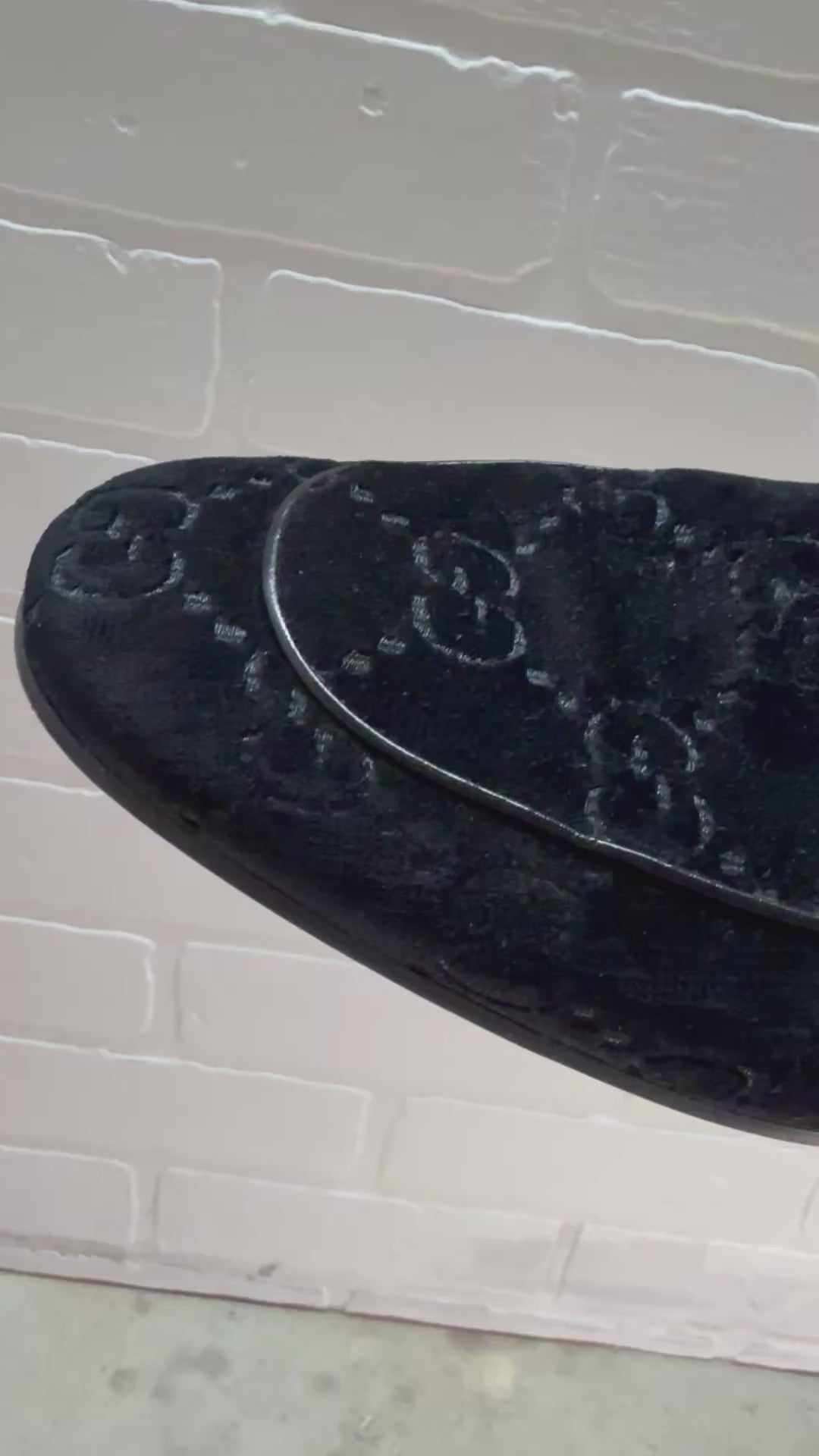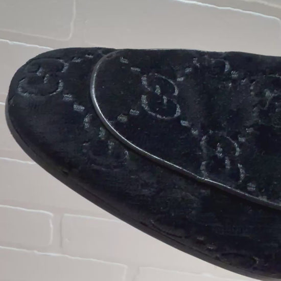 Gucci Jordaan GG Velvet Loafers with gold-toned horsebit hardware. These iconic loafers feature a black velvet upper with an embossed interlocking "GG" pattern and black leather trim. Very good condition.