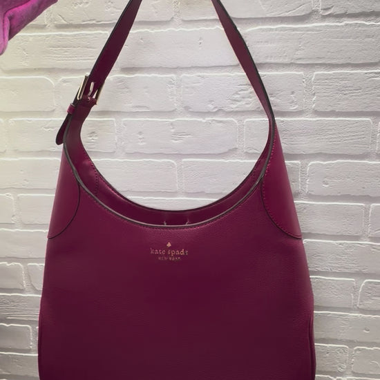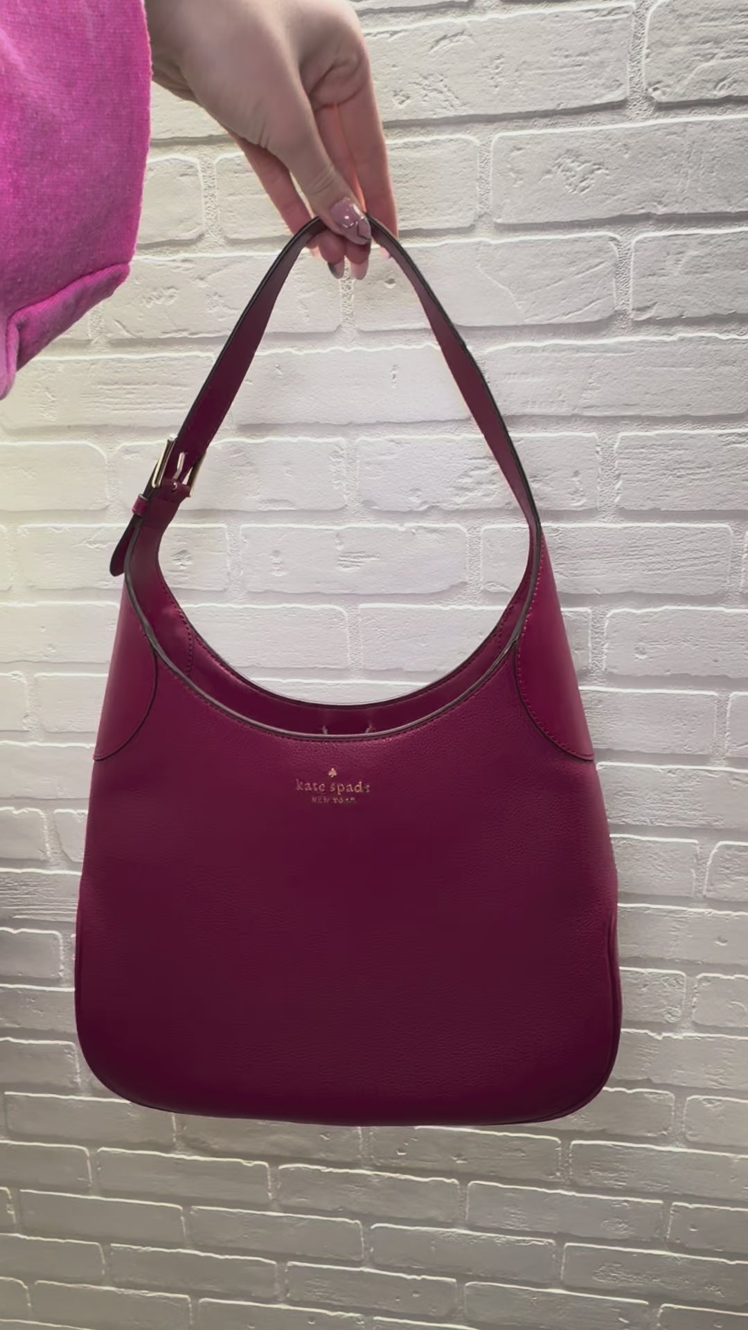 Timeless with a rich pop of color, this Kate Spade New York shoulder bag is the definition of effortless polish. Crafted in smooth pebbled leather, it features a structured yet relaxed silhouette that sits comfortably on the shoulder. The deep burgundy hue adds a sophisticated statement while remaining neutral enough for everyday wear. Finished with gold-tone hardware and the signature Kate Spade logo, this bag is equal parts practical and elevated.
