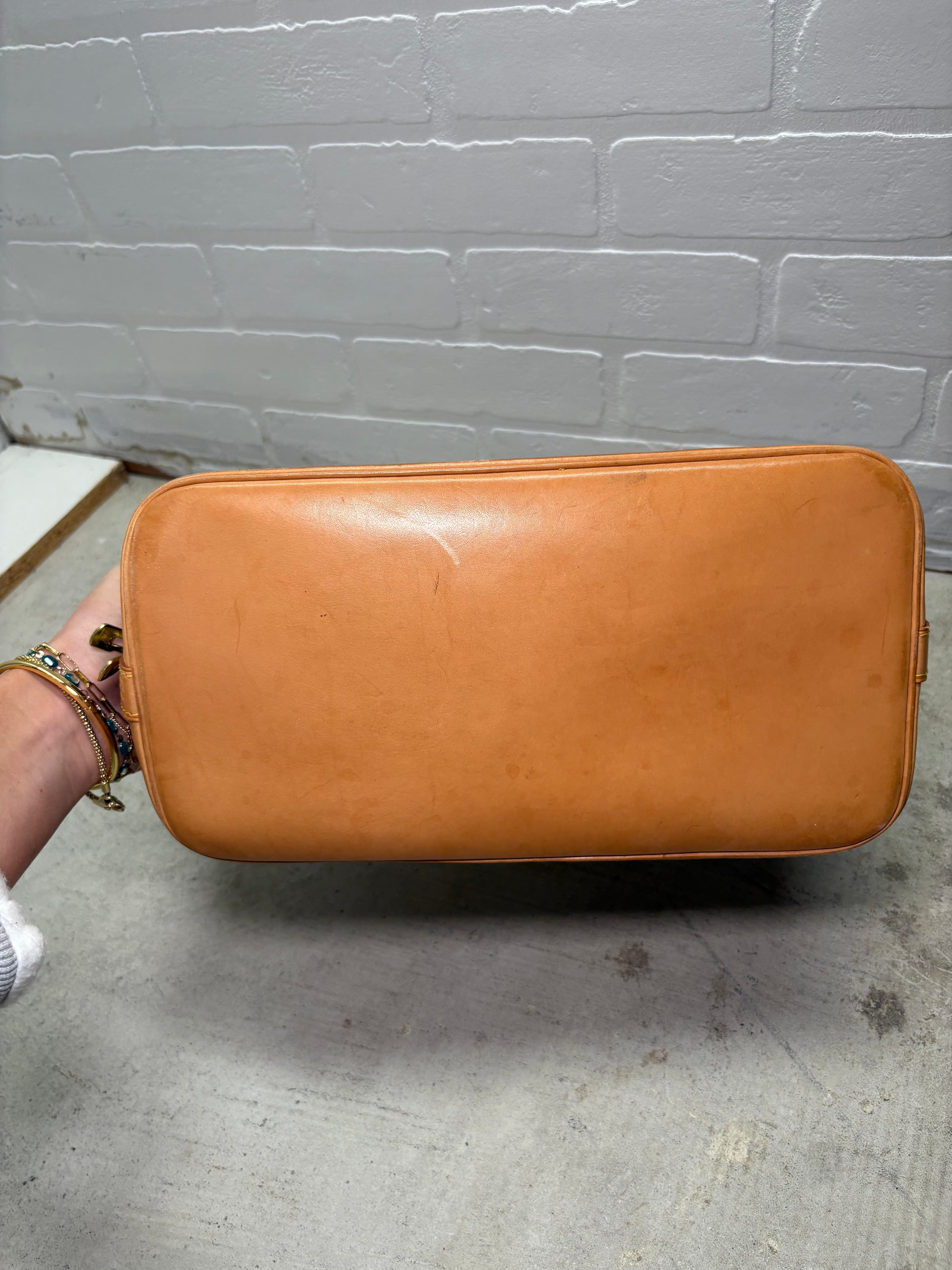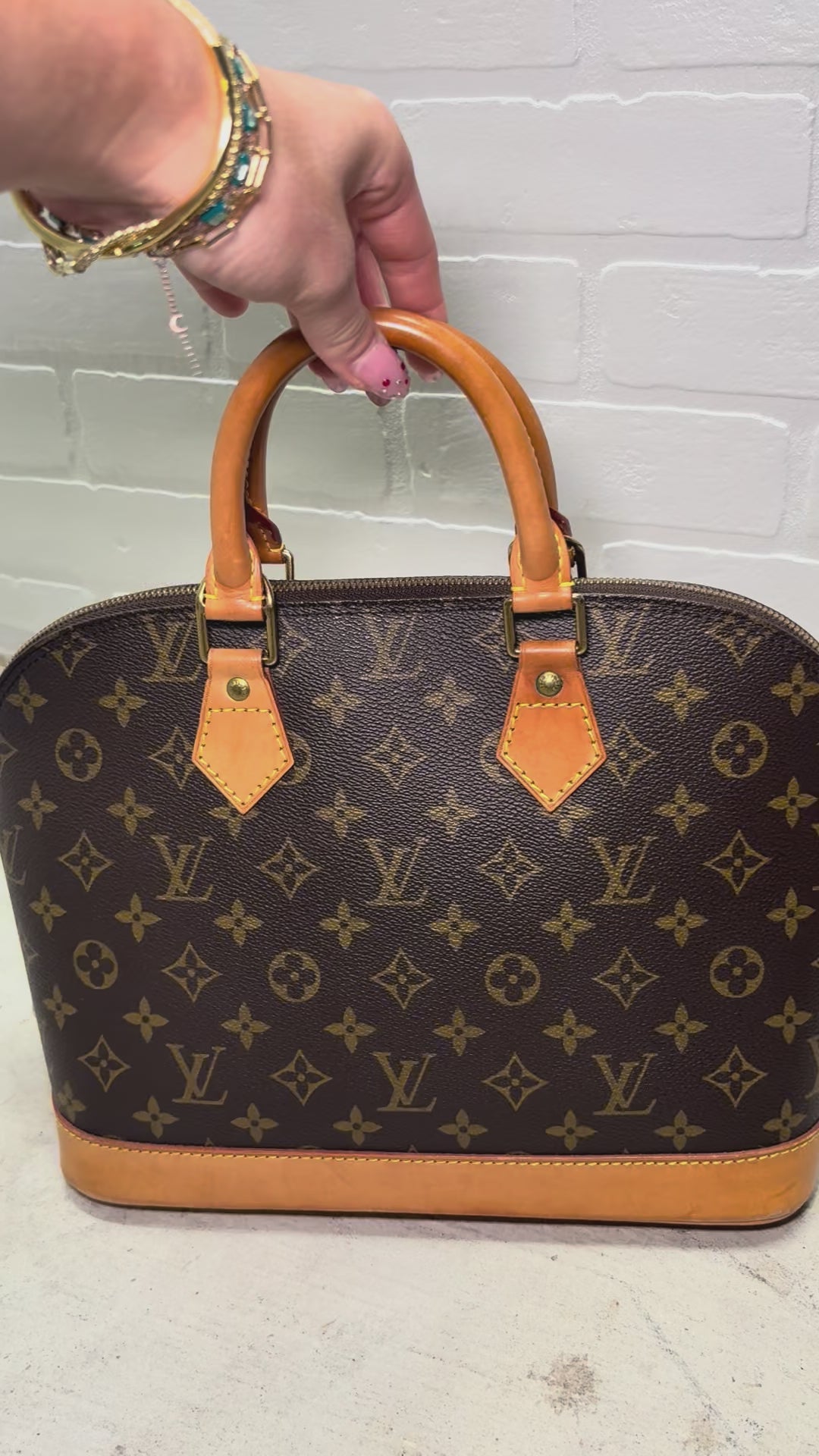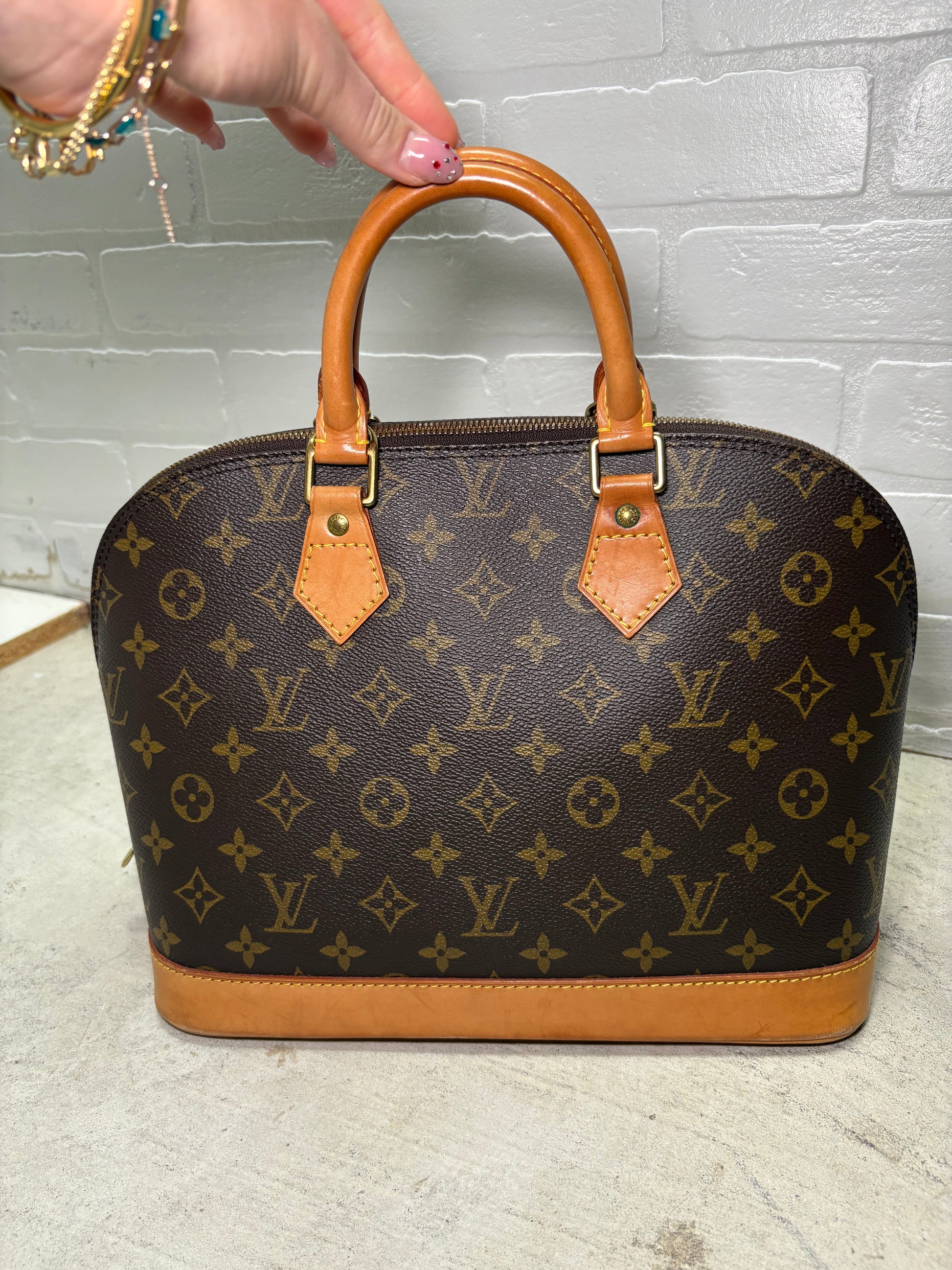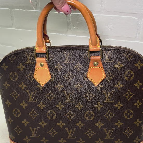 Pristine condition Louis Vuitton Alma PM handbag in monogram canvas with natural cowhide leather trim and gold-color hardware