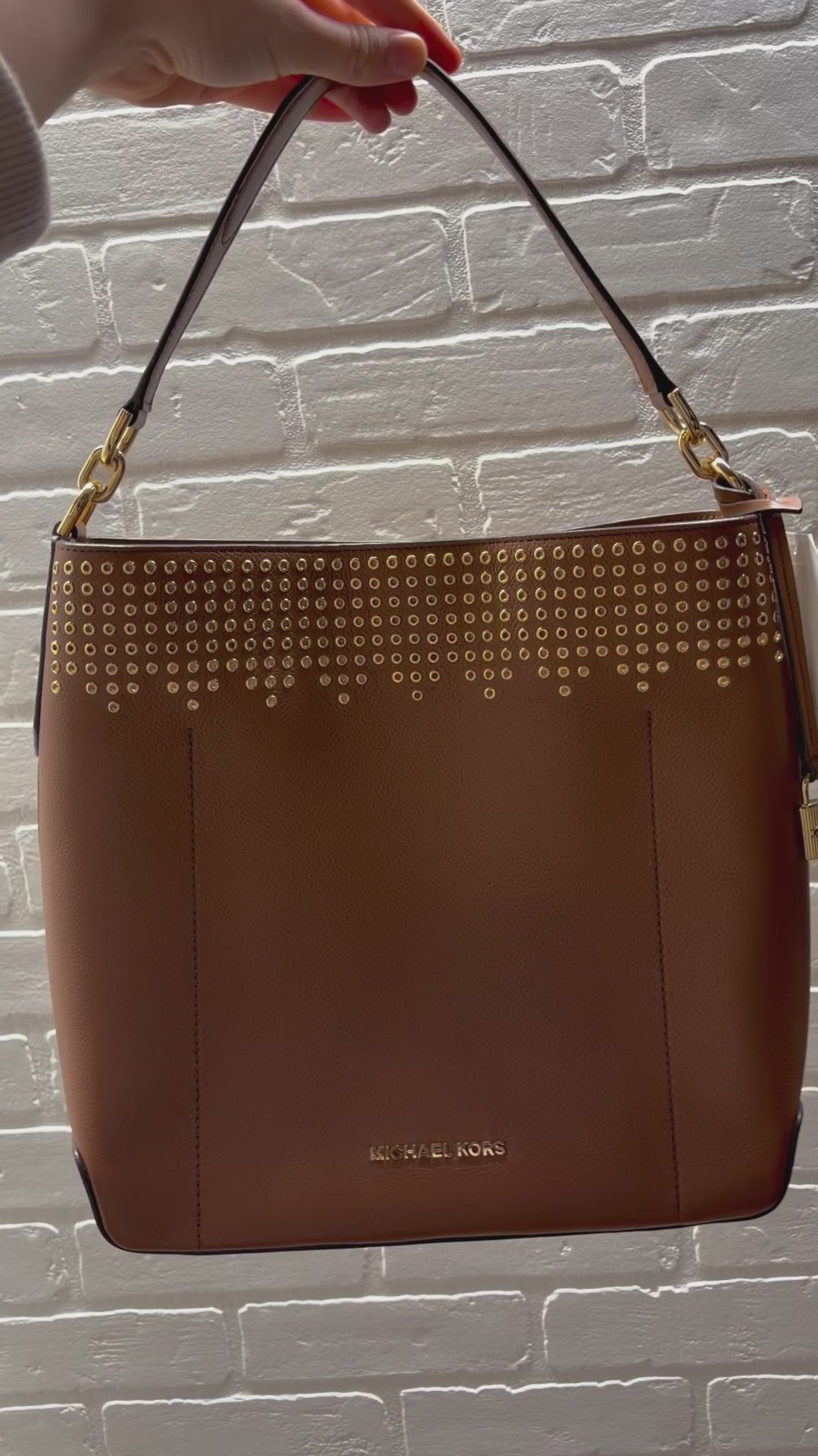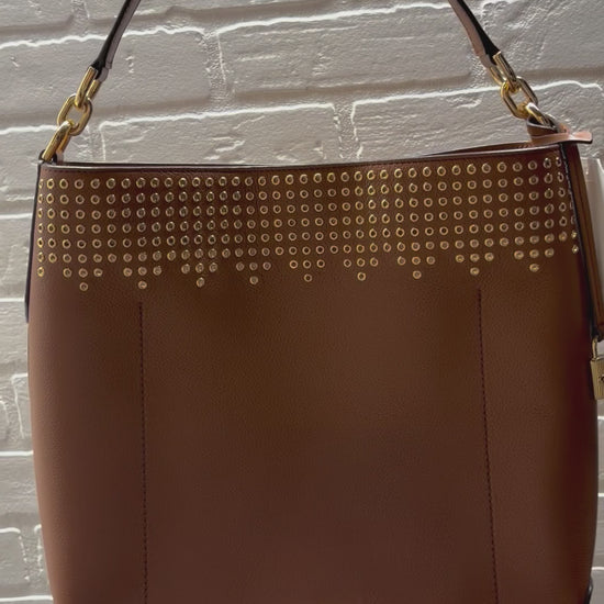 This large, brown bag is made of pebbled leather and features gold-tone hardware, including decorative grommets along the top edge. It secures with a magnetic snap closure and offers functional storage with both interior and exterior slip pockets.