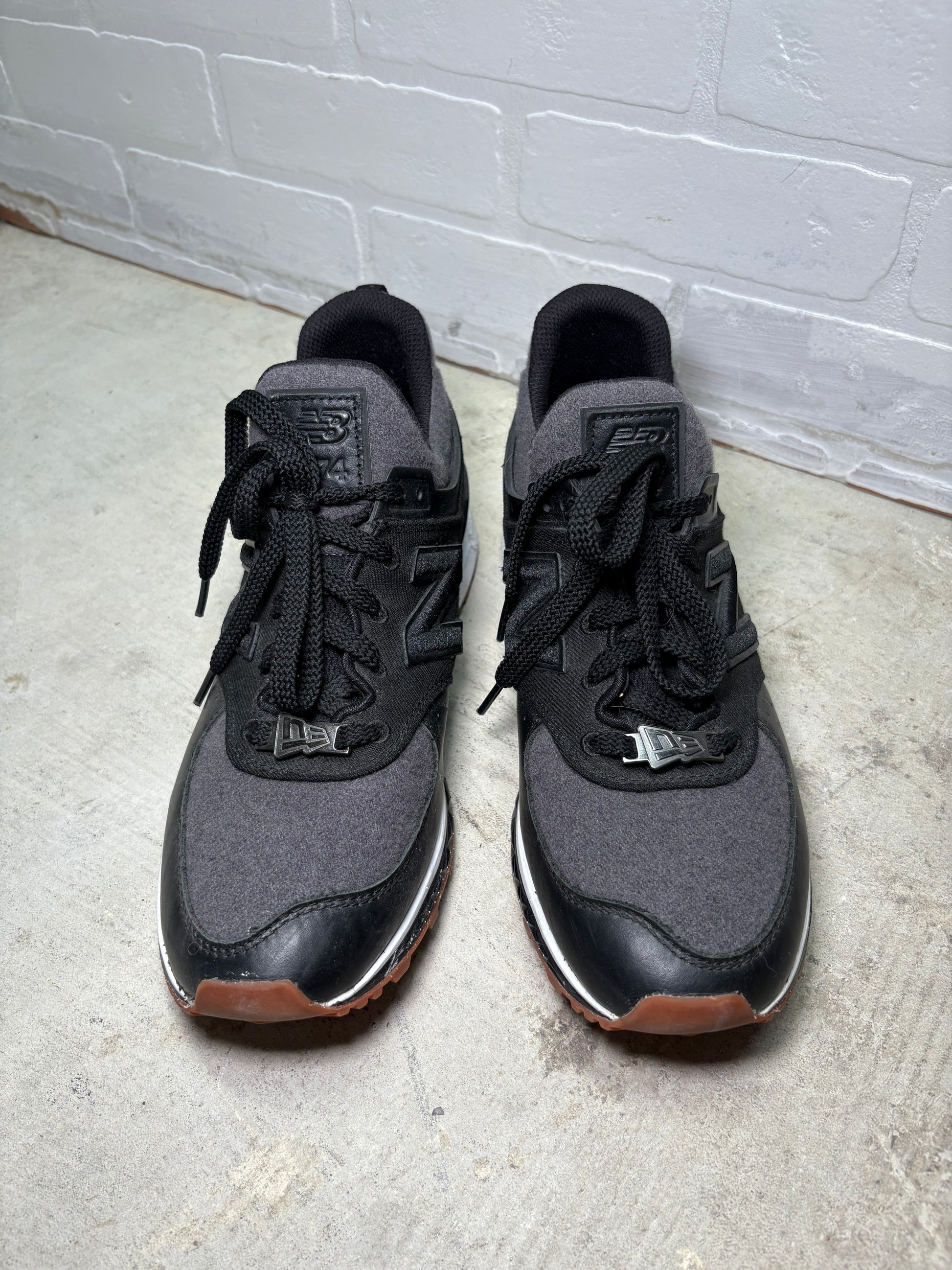 New Balance 574 sneakers in black and gray featuring cushioned midsole and durable outsole. Comfortable everyday shoes with athletic and casual versatility. Shows light wear consistent with normal use.