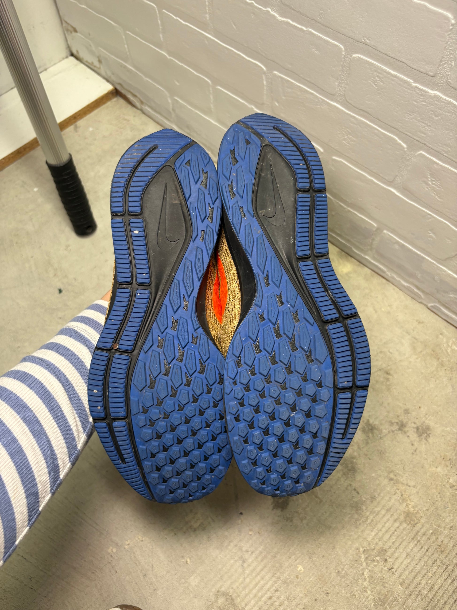 Nike athletic running shoes featuring a breathable tan knit upper with blue accents and bold orange Swoosh. Lightweight and comfortable with cushioned midsole, perfect for running, walking, or everyday wear. Normal signs of light wear. Soles and uppers in good shape.
